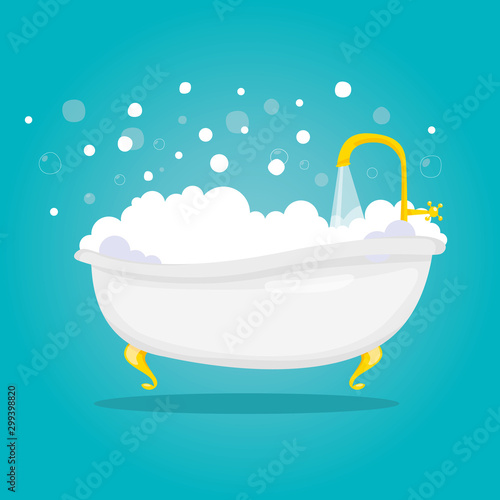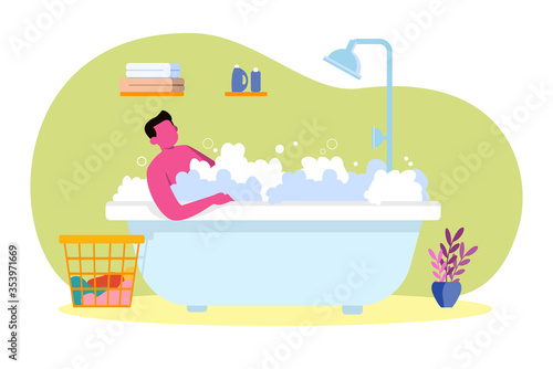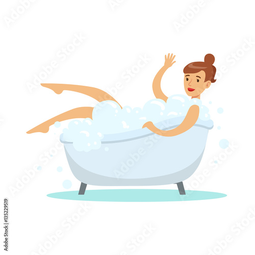 Женщина с ноутбуком принимает ванну векторная иллюстрация. Счастливая женщина расслабляется в ванной, проводя время онлайн, занимаясь серфингом в Интернете, общаясь в социальных сетях или просматривая обучающий вебинар