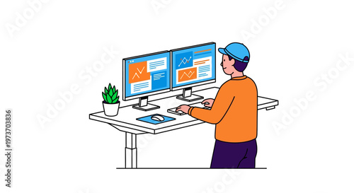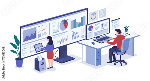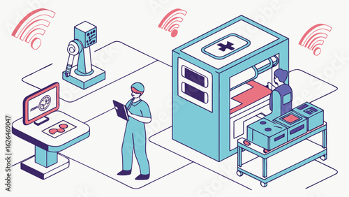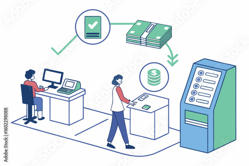 Женщина, использующая услугу самостоятельного заказа для покупки продуктов питания в продуктовом магазине, векторная иллюстрация. Интерактивный цифровой киоск супермаркета для совершения покупок с автоматической оплатой