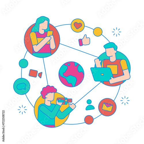 Женщина, использующая набор векторных сцен социальных сетей для смартфонов. Молодые люди-блогеры фотографируют еду или селфи с помощью камеры мобильного гаджета. Видеоблогер, снимающий видео для канала vlog