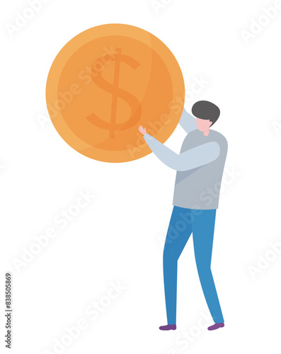 Женщина-волонтер, жертвующая деньги в векторе. Значок благотворительности и пожертвования. Женский персонаж, несущий золотую долларовую монету, выделенную на белом фоне