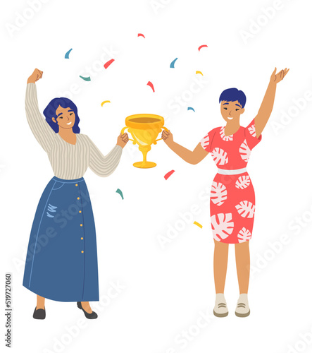 Вектор женщин-победительниц. Иллюстрация двух счастливых девушек с золотым кубком-трофеем, празднующих победу. Бизнесвумен в восторге от выигрыша приза. Празднование успеха бизнес-команды. Женская власть