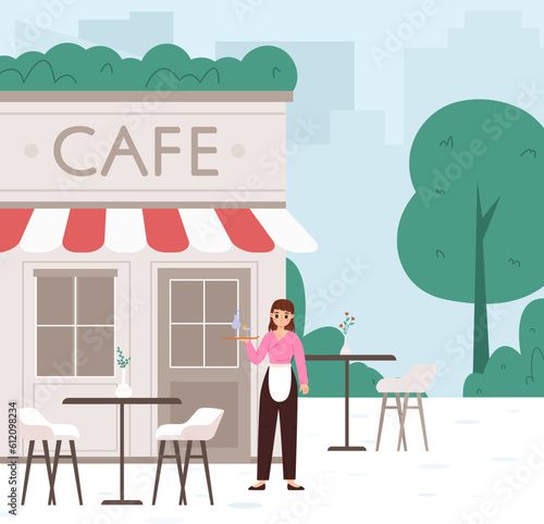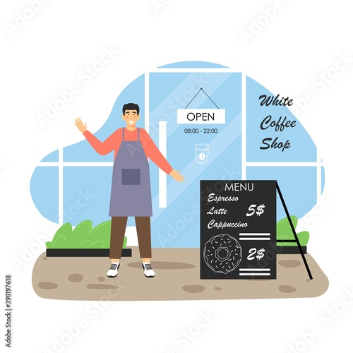 Женщина с собакой проходит мимо кафе со стеклянной дверью. Люди пьют кофе в ресторане, концепция векторной иллюстрации. Владелец кафе приветствует посетителей перед своим магазином.