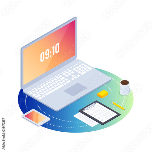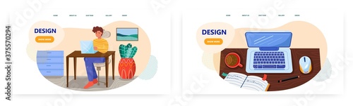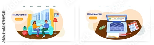 Женщина с ноутбуком и мужчина сидят дома на диване. Вид сверху на открытый ноутбук. Иллюстрация концепции бизнеса и домашнего офиса. Векторный шаблон дизайна веб-сайта.
