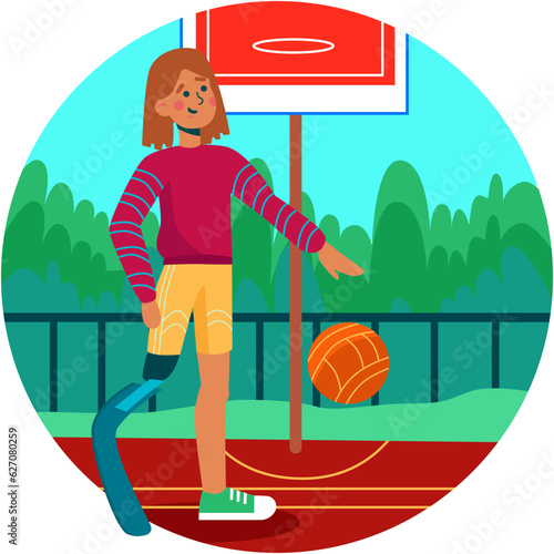 Женщина со спортивным протезом коленного сустава играет в баскетбол. Иллюстрация концепции инвалидности. Векторный шаблон дизайна веб-сайта. Девочка-инвалид на инвалидной коляске рисует пейзаж у себя дома.