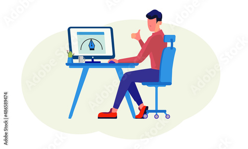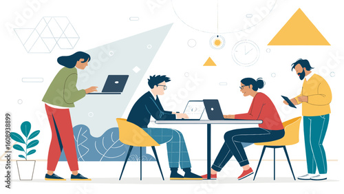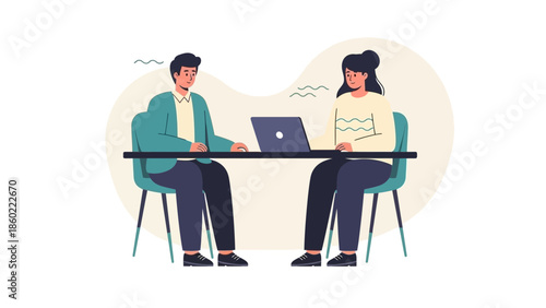 Женщина, работающая на ноутбуке, сидя за столиком кафе векторная иллюстрация. Неформальное рабочее место внештатных бизнесменов. Удаленная работа, дистанционная подработка, онлайн-занятие