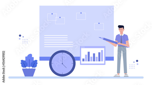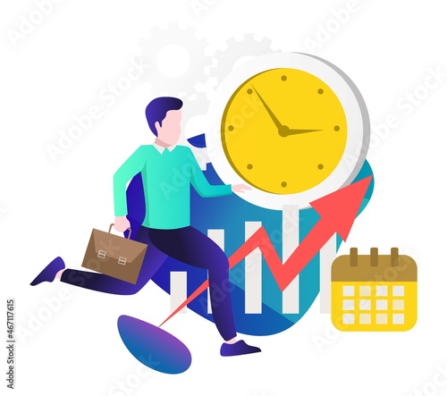 Женщина, работающая на ноутбуке, сидящая на огромных часах, плоская векторная иллюстрация. Список дел. Песочные часы. Тайм-менеджмент, планирование, составление расписания, дедлайн.