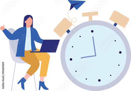 Женщина, работающая за ноутбуком, сидя на огромных часах, плоская векторная иллюстрация. Список дел. Песочные часы. Тайм-менеджмент, планирование, составление графиков, дедлайн.