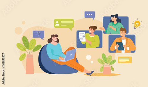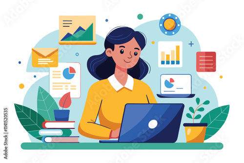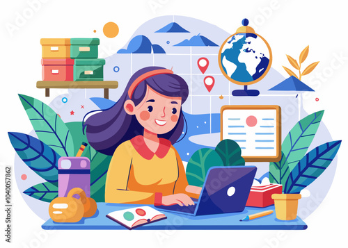 Женщина работает с ноутбуком в домашнем офисе. Иллюстрация бизнес-концепции. Векторный шаблон дизайна веб-сайта. Открытый ноутбук и кофе на столе.