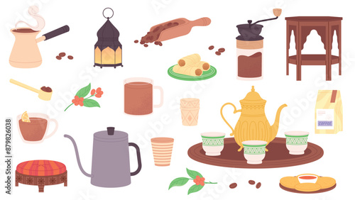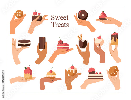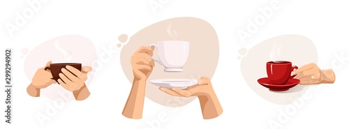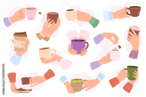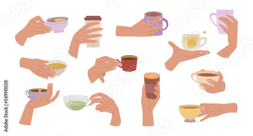 Женские руки, держащие чайные чашки и кофейные кружки, плоская векторная изолированная иллюстрация. Горячие напитки, чтобы согреться.