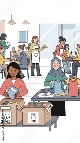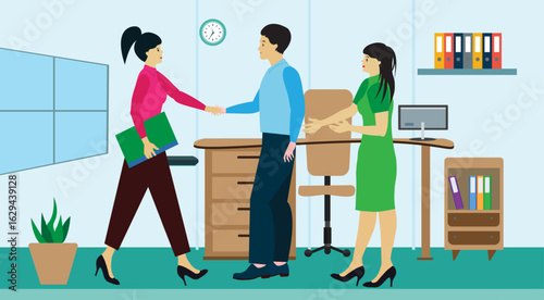 Женщины делают покупки и покупают одежду в магазине одежды или бутике одежды. Векторная иллюстрация концепции модного платья. Покупательницы примеряют платье в гримерке. Интерьер модного магазина.