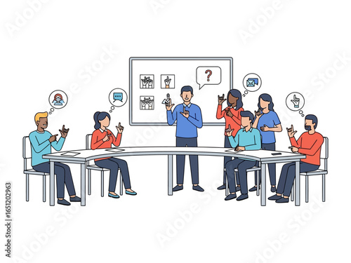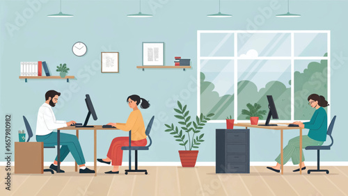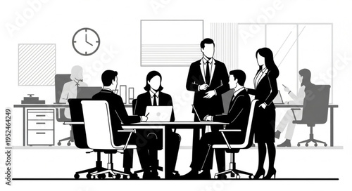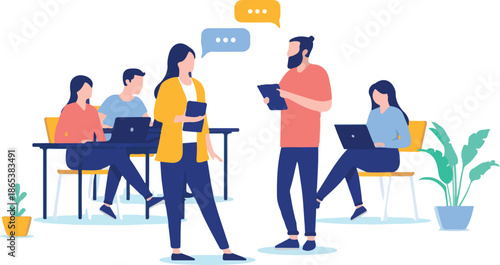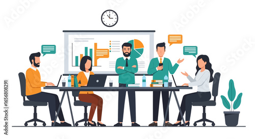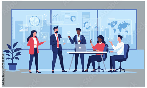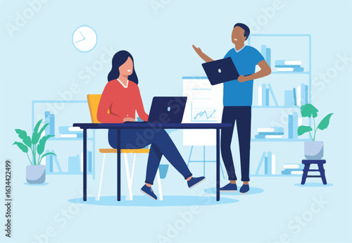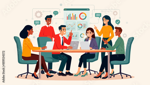 Векторная иллюстрация деловой встречи на рабочем месте. Интерьер офиса. Планирование работы, планирование, мозговой штурм, элемент концепции командной работы в плоском стиле.