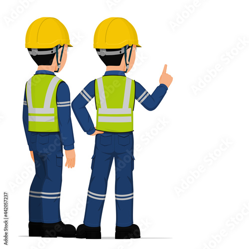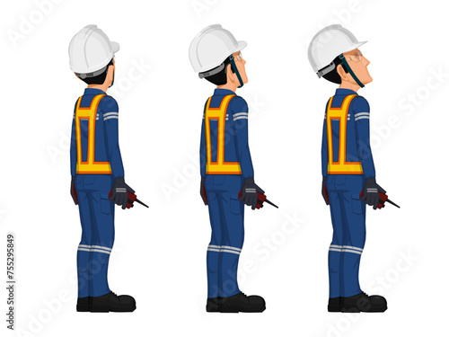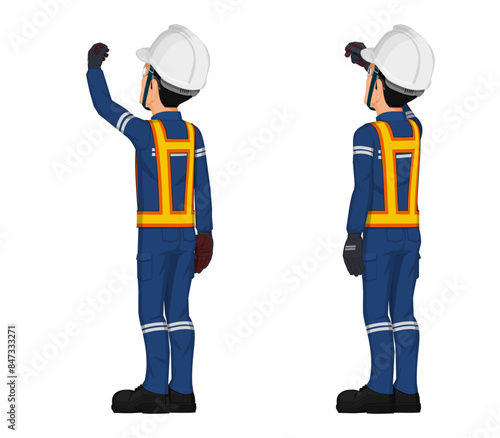 Профессиональная рабочая одежда и комплект униформы, векторная иллюстрация, изолированная на белом фоне. Реалистичная защитная рабочая одежда, ботинки, защитные очки и желтый шлем.