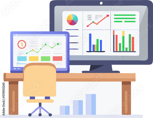 Рабочее место на летнем тропическом пляже шаблон векторного плаката. Портативный компьютер, коктейль "пина колада", фотоаппарат, солнцезащитные очки на столе под пляжным зонтиком. Фриланс, удаленное рабочее место, дизайн в плоском стиле.
