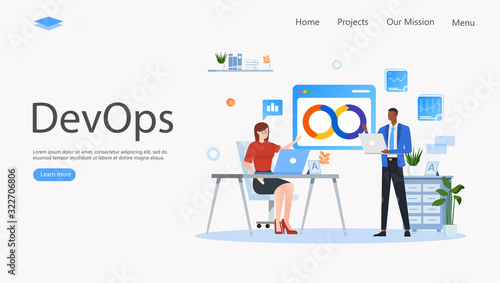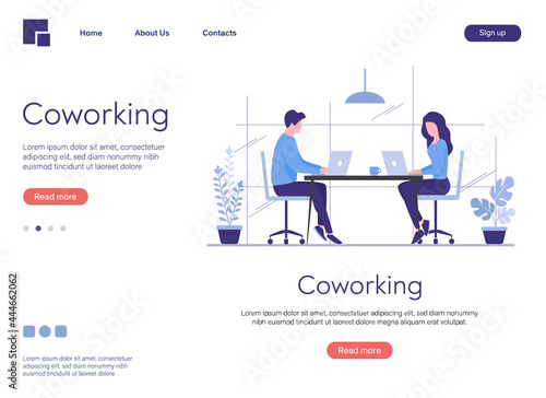Шаблон векторного веб-сайта рабочей области, дизайн веб-страницы и целевой страницы для разработки веб-сайтов и мобильных сайтов. Компьютерные программисты работают и отдыхают на офисном рабочем месте.