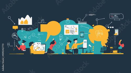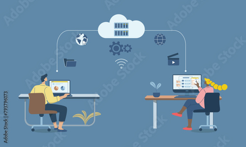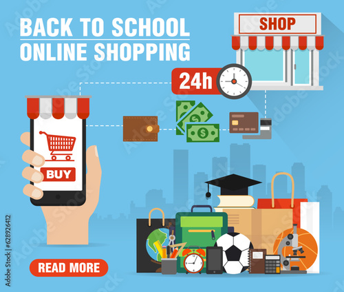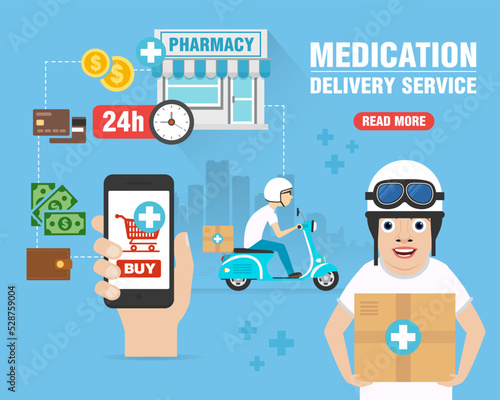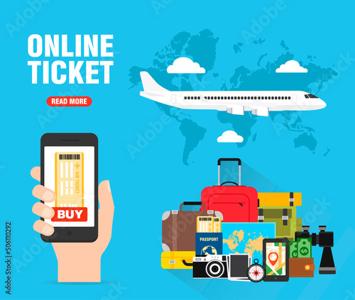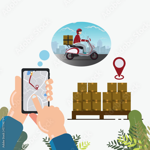 Векторная плоская иллюстрация концепции доставки по всему миру. Компьютер с картой мира на мониторе, беспилотник с посылкой, грузовик, календарь с глобусом, рука держит смартфон с корзиной покупок. Плакат службы доставки.