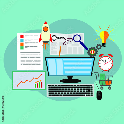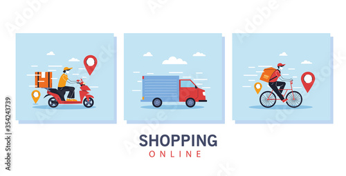 Векторная плоская иллюстрация концепции доставки по всему миру. Компьютер с картой мира и указанием местоположения на мониторе, беспилотный летательный аппарат, доставляющий посылку, глобус, грузовик. Доставка, отслеживание, услуги доставки плакат, баннер.