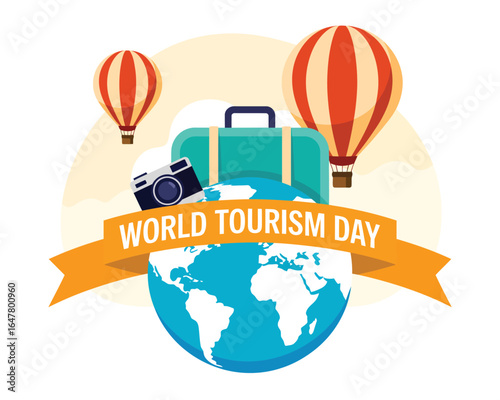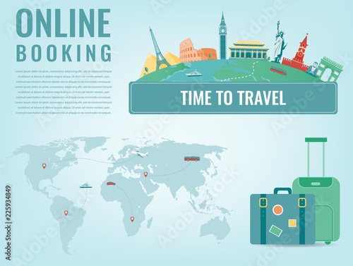 Векторная плоская иллюстрация концепции доставки по всему миру. Компьютер с картой мира на мониторе, беспилотный летательный аппарат, доставляющий посылку, грузовик, глобус, календарь. Служба доставки плаката, баннера.
