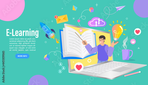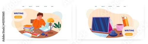 Написание дизайна целевой страницы, набор шаблонов баннеров веб-сайта, плоская векторная иллюстрация. Студент учится, делает письменное упражнение с пером и чернилами. Писатель, журналист работает, сидя за письменным столом.