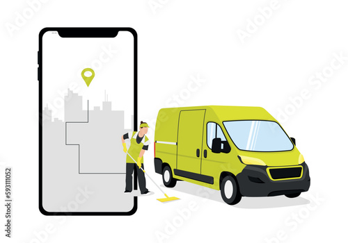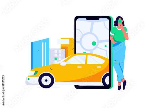 Желтое такси, мужчина, стоящий на экране смартфона с маршрутом, пин-код местоположения на карте города, плоская векторная иллюстрация. Онлайн-служба такси.