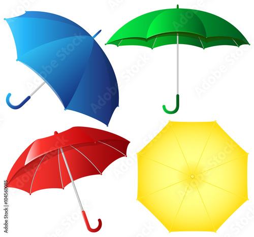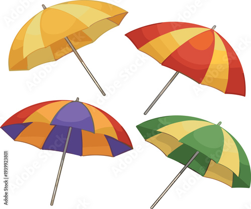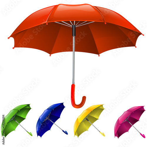 Векторная реалистичная иллюстрация желтых зонтиков в различных положениях. Открытый и снятый значок зонтика установлен изолированно на белом фоне.