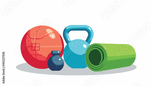 Оборудование и аксессуары для йоги и фитнеса. Векторные реалистичные упражнения, свернутый коврик для йоги, скакалка, гантели, фитбол, весы, секундомер, бутылка с водой и т.д.