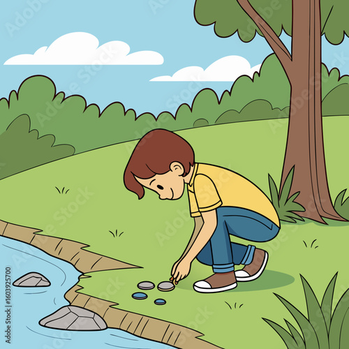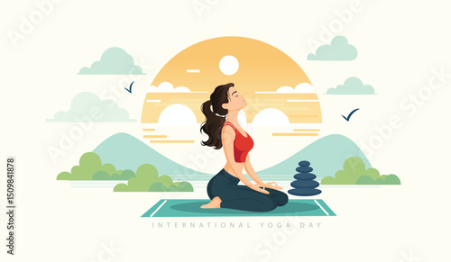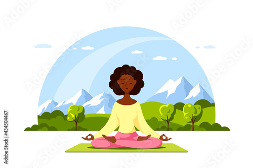 Счастливая женщина медитирует, сидя в позе лотоса йоги у костра, плоская векторная иллюстрация. Девушка отдыхает, расслабляясь на свежем воздухе. Занятия йогой, медитативный ретрит, здоровый образ жизни, путешествия на природу.