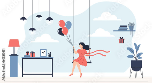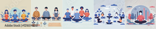 Молодая женщина медитирует, расслабляясь, сидя в позе йоги лотоса, векторная иллюстрация дизайна в плоском стиле. Занятия йогой, велнес, спа-услуги.