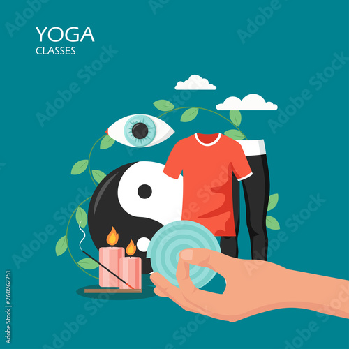 Занятия йогой векторная плоская иллюстрация. Символ Инь и ян, человеческая рука, спортивная одежда, коврик, глаз, свечи, жест рукой Гьян Мудра. Символы йоги и аксессуары для веб-баннера, страницы веб-сайта и т.д.