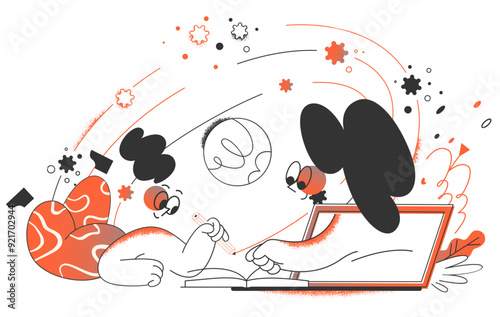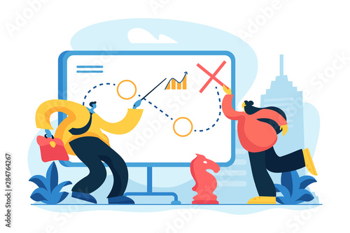 Векторная иллюстрация дизайна в плоском стиле с изображением большого символа Инь и Ян и крошечных женщин, занимающихся йогой. Концепция асаны практики йоги для веб-баннера, страницы веб-сайта и т.д.