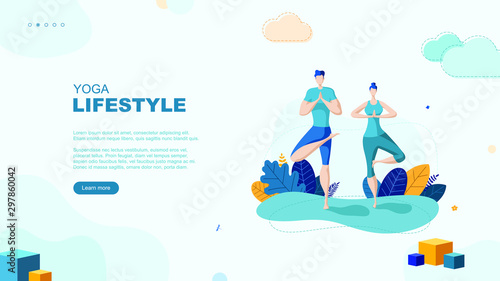 Векторный шаблон веб-сайта Yoga, дизайн веб-страницы и целевой страницы для разработки веб-сайтов и мобильных сайтов. Класс йоги практикует концепцию асаны с большим цветком лотоса и крошечными персонажами.