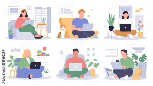 Молодые и пожилые женщины, сидящие на своих кроватях с портативными компьютерами, плоская векторная иллюстрация. Интерьер спальни, женские персонажи, работающие удаленно из дома, общение в чате, серфинг в сети, учеба онлайн