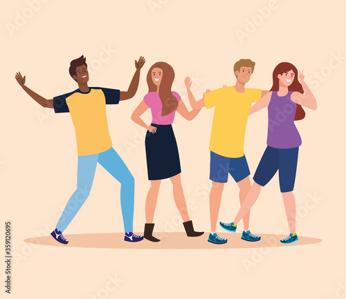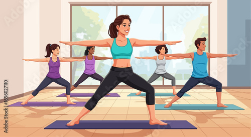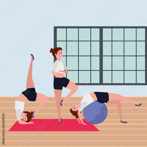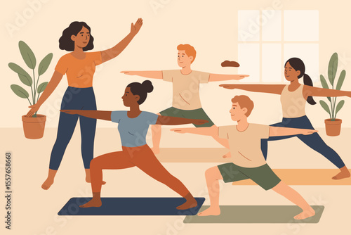 Юные балерины тренируются на уроке хореографии в балетной школе векторная иллюстрация. Группа женских персонажей упражняется, отрабатывая движения под контролем учителя. Сцена