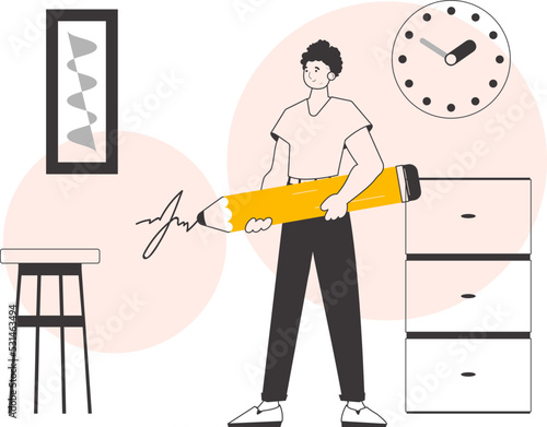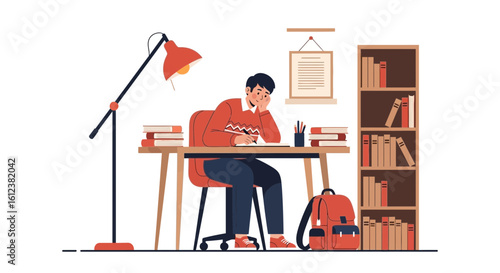 Молодой бородатый мужчина читает векторную иллюстрацию книги. Плоский персонаж-читатель мужского пола, стоящий перед книжной полкой, изолированный на белом фоне. Умный парень наслаждается хобби. Студент учится, готовится к экзамену