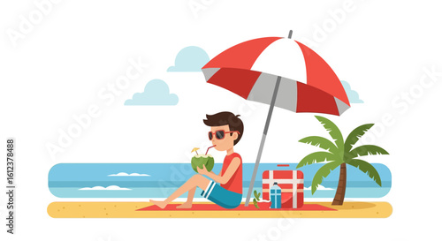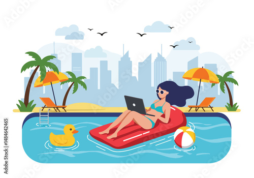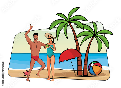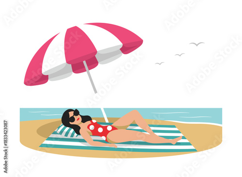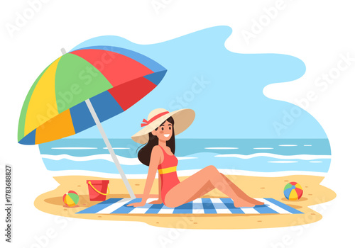 Молодая девушка в купальнике играет с мячом на пляже, плоская векторная иллюстрация. Летние путешествия, тропические каникулы, пляжный отдых.