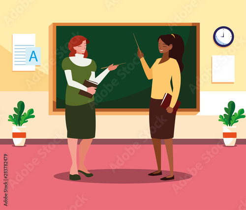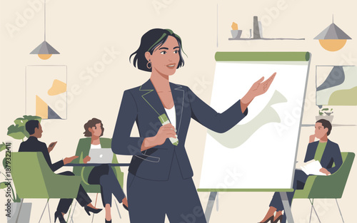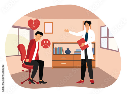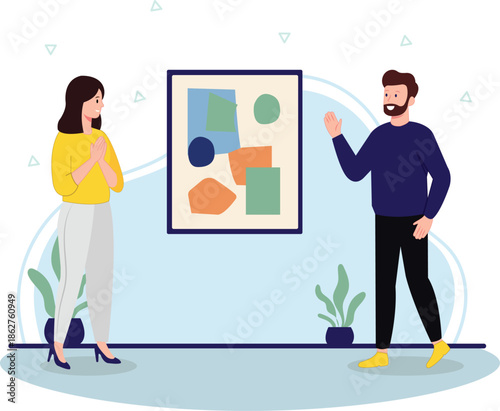 Молодой человек выбирает картинку для покупки, плоская векторная иллюстрация. Женщина показывает картину, произведение искусства клиенту. Модернизация гостиной квартиры, дома для комфорта. Обустройство дома.