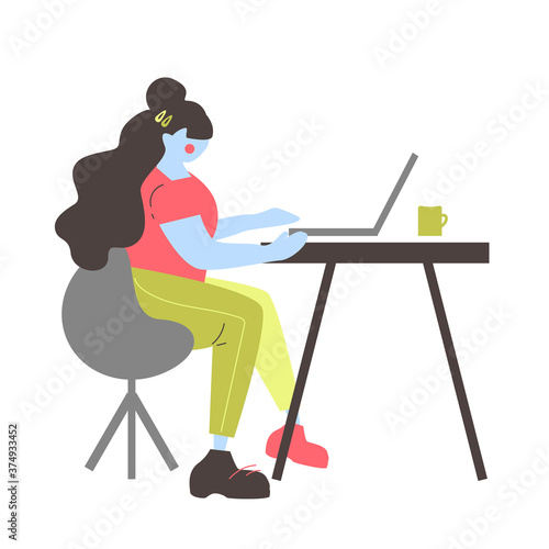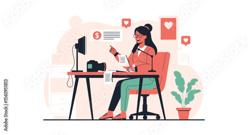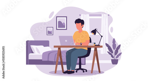 Молодой человек в наушниках, говорящий в микрофон перед портативным компьютером, плоская векторная иллюстрация. Ди-джей создает подкаст, ведет прямое радиошоу в студии. Подкастинг, онлайн-радиостанция.