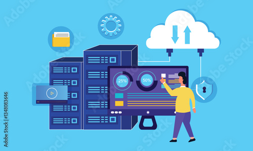 Молодой человек делает упражнения для жима лежа, поднимая штангу, векторная плоская иллюстрация. Тренировка с личным тренером. Силовые упражнения, бодибилдинг, спорт и здоровый образ жизни.