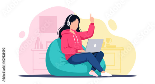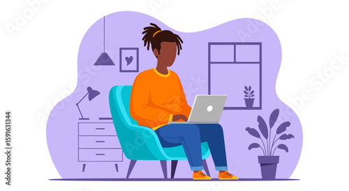 Молодой человек, фрилансер, работающий на портативном компьютере из дома в уютной гостиной, сидя на стуле, плоская векторная иллюстрация. Фриланс, удаленная работа, рабочее пространство домашнего офиса.