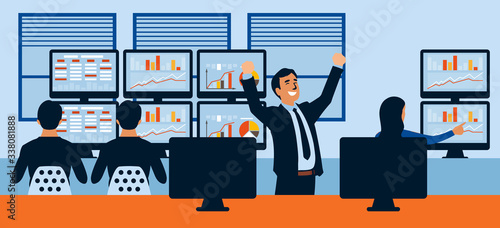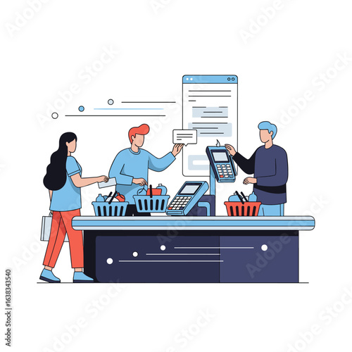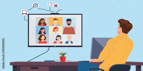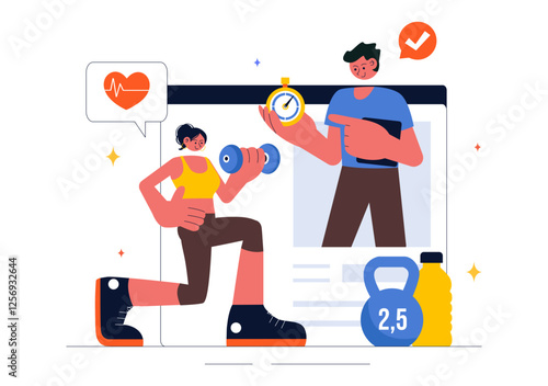 Счастливая пара, общающаяся через Интернет, плоская векторная иллюстрация. Молодой человек держит в руках мобильный телефон и отправляет подарок, пиццу в коробке с лентой своей девушке. Служба онлайн-доставки пиццы.