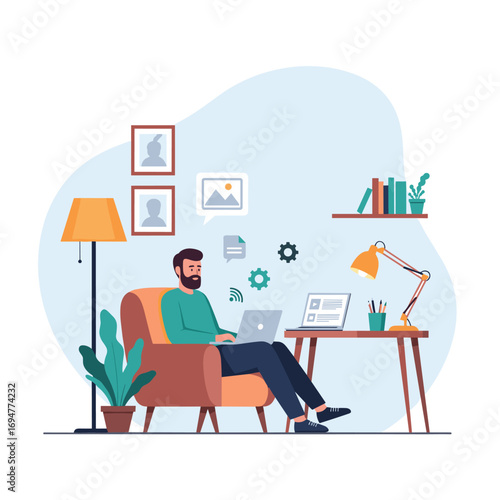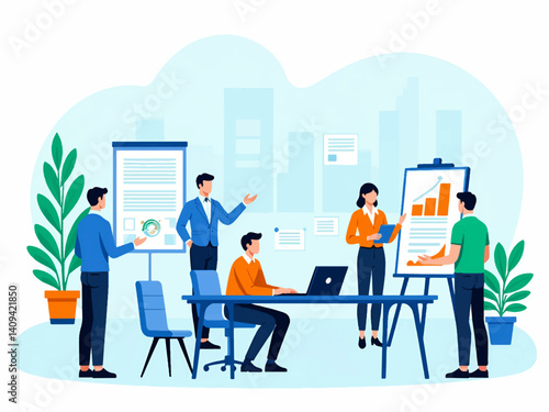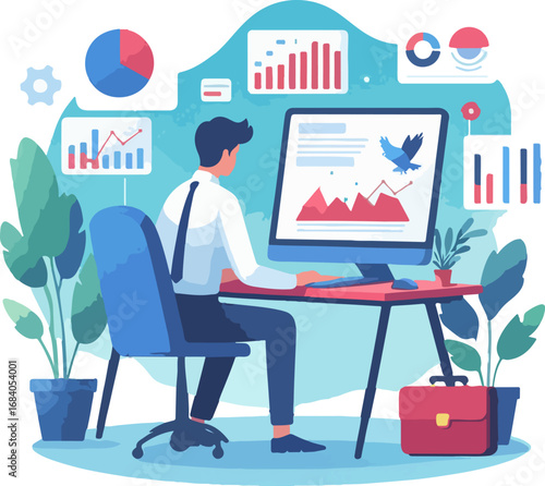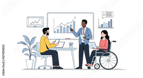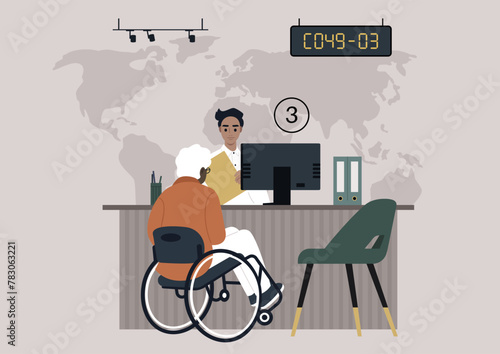 Молодой человек в инвалидной коляске, работающий в офисе, плоская векторная иллюстрация. Бизнесмен с физическими недостатками. Образ жизни человека с ограниченными возможностями. Трудоустройство инвалидов.
