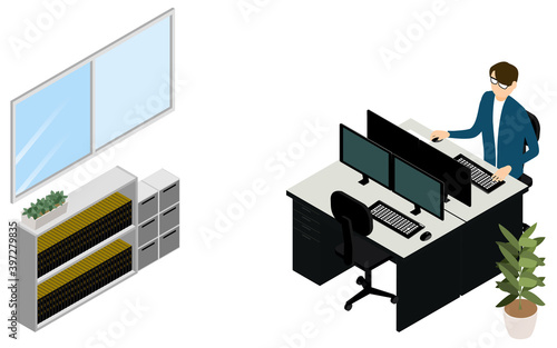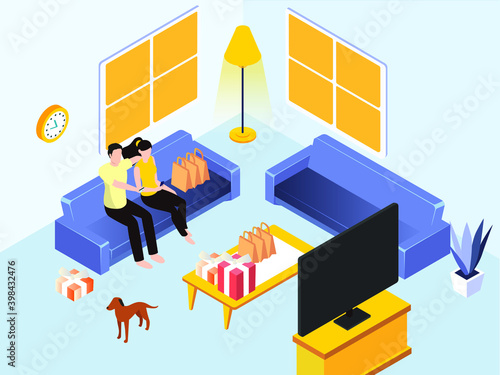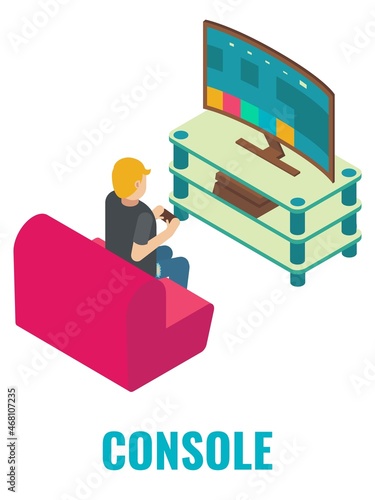 Молодой человек, играющий в консольную игру, плоская векторная изометрическая иллюстрация. Игровой клуб, комната, зона аттракционов, веселые мероприятия, развлечения.