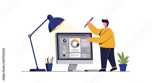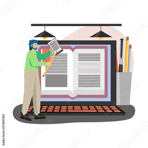 Портативный компьютер с математической книгой на экране, человек с планшетом, изучающий математику дома, плоская векторная иллюстрация. Онлайн-курсы математики, дистанционное обучение, дистанционное образование, электронное обучение.