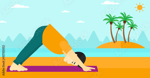 Молодые люди, практикующие йогу на пляже, плоская векторная иллюстрация. Активный и здоровый образ жизни, пляжная йога, летние развлечения.