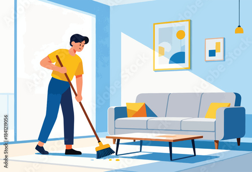 Молодая женщина, горничная, экономка, работник клининговой компании, домохозяйка пылесосит гостиную пылесосом и средством для мытья полов, плоская векторная иллюстрация. Уборка номеров, услуги по уборке дома.