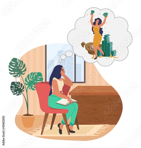 Молодая женщина, сидящая на стуле с книгой на коленях и мечтающая о деньгах, плоская векторная иллюстрация. Мечтательная девушка, думающая о богатстве.