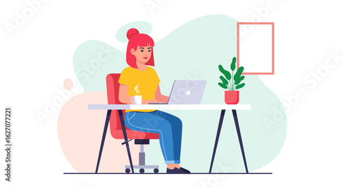 Персонаж молодой женщины-портнихи, шьющий на машинке в мастерской. Женщина-швея-модельер наслаждается хобби по рукоделию, домашний досуг векторная иллюстрация