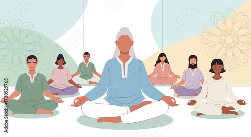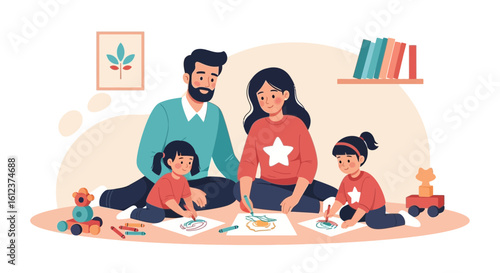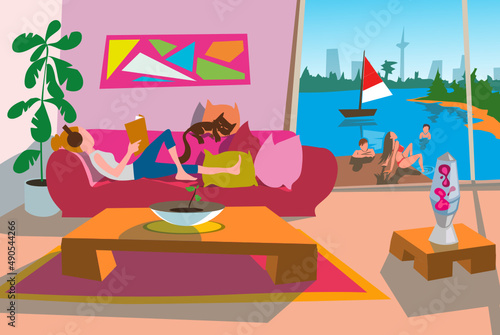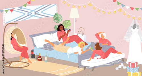 Подруги молодой женщины веселятся, сплетничают, пьют алкогольные напитки на домашней пижамной вечеринке перед свадьбой векторная иллюстрация. Интерьер комнаты украшен гирляндой из флагов и свадебным платьем в углу