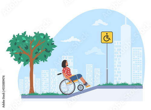 Молодая женщина в инвалидной коляске едет по улице векторной иллюстрацией. Безбарьерная среда для людей с ограниченными физическими возможностями. Хорошо оборудованная парковая зона для людей с особыми потребностями