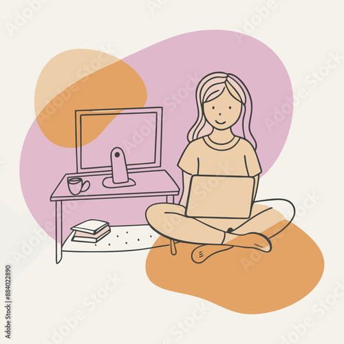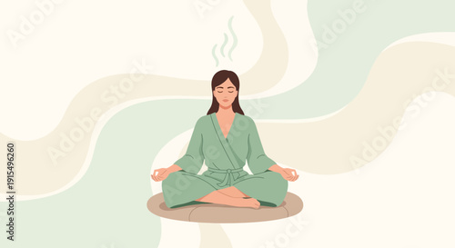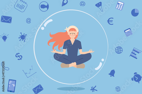 Молодая женщина медитирует, сидя в позе йоги, плоская векторная иллюстрация. Девушка отдыхает без кофе, мобильного телефона и портативного компьютера. Гармония, хорошее самочувствие. Время для йоги. Здоровый образ жизни.