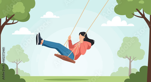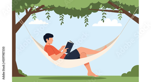 Молодая женщина читает в гамаке плоскую мультяшную векторную иллюстрацию. Девушка-книголюбка лежит на подвесной кровати на заднем дворе. Летние каникулы и учеба.